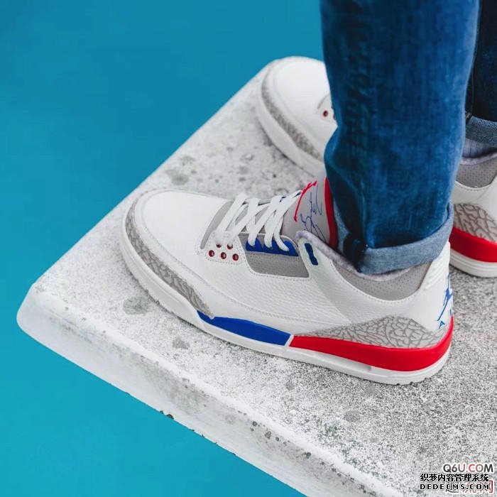 这款AJ3配色设计灵感就来源于这场比赛。鞋款上的红色和蓝色色块来自于这场慈善赛球员们身上穿着球衣的颜色,左脚鞋舌上那个角度略显特别的迈克尔·乔丹签名.